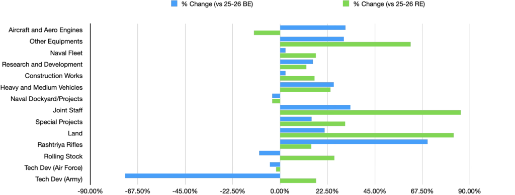 The Capital Outlay is the most critical segment for long-term capability building. The Budget Estimate (BE) for 2026-27 represents a significant 17.62% increase in Revised Estimate to Budget Estimate (RE to BE) and 21.84% in BE to BE.